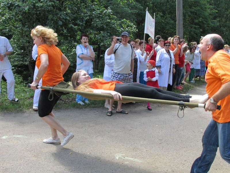 На первом этапе конкурса команды озвучили свои девизы. Девиз команды победителей звучал так: «Лечить всегда, лечить везде, лечить на суше и в воде!». Члены жюри оценили приветствие, внешний вид и эмблемы команд. На втором этапе были проведены несколько состязаний. Первое испытание заключалось в том, кто быстрее донесет носилки с пациентом по тропинке с препятствиями. В этом задании отличилась команда «Айболит» в лице заведующей поликлиникой И.Ю.Мигаль. Во втором испытании нужно было быстро и качественно наложить повязку «Чепец». Здесь бесспорным лидером оказался медицинский брат отделения анестезиологии и реанимации Р.В.Басукинский. Третье испытание «Медицинский дартс» оказалось более сложным. Шприцем с иглой необходимо было попасть в верхнюю правую часть поля для метания дротиков с расстояния одного метра, подразумевая внутримышечную инъекцию в правую ягодицу. С этим заданием справилась лучше всех команда КИО в лице рентгенолаборанта И.А.Бойковой. Четвертое испытание «Конкурс капитанов» сделало задумчивыми лица глав команд, которым пришлось вспомнить учебники из медакадемии. Зато в творческом испытании все члены команд объединились и из предложенных овощей и фруктов смастерили поделки на медицинскую тематику.